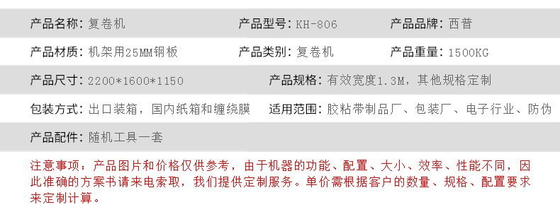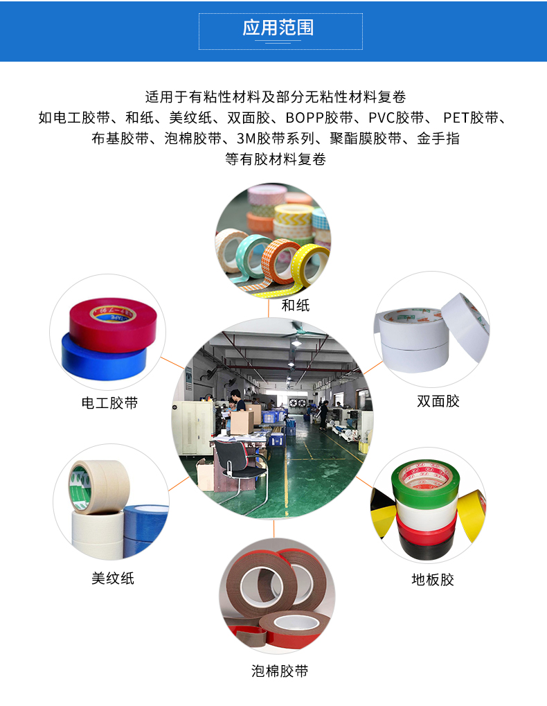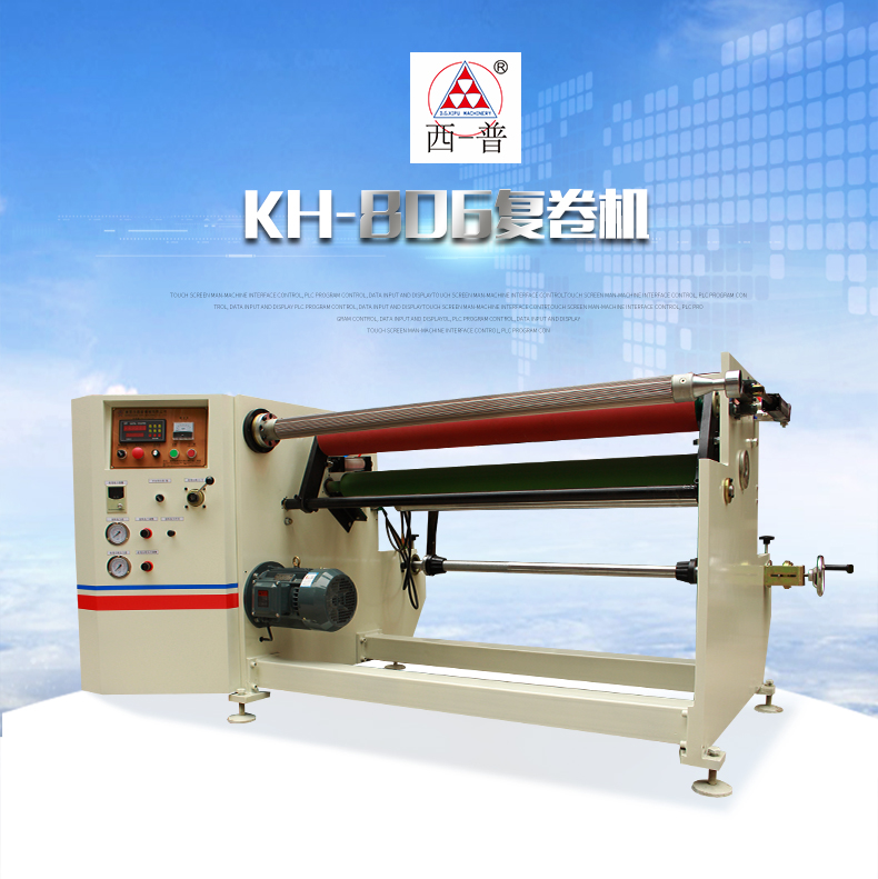 用途:型号: KH-806型复卷机。适用于任何有粘性材料及部分无粘性材料之复卷,如双面胶带、美纹胶带、PVC胶带、PET胶带、布基胶带、金手指胶带、玛拉胶带、PE保护膜、离型纸等。可选米轮记长和对边装置,米数更精准,卷面更平整。