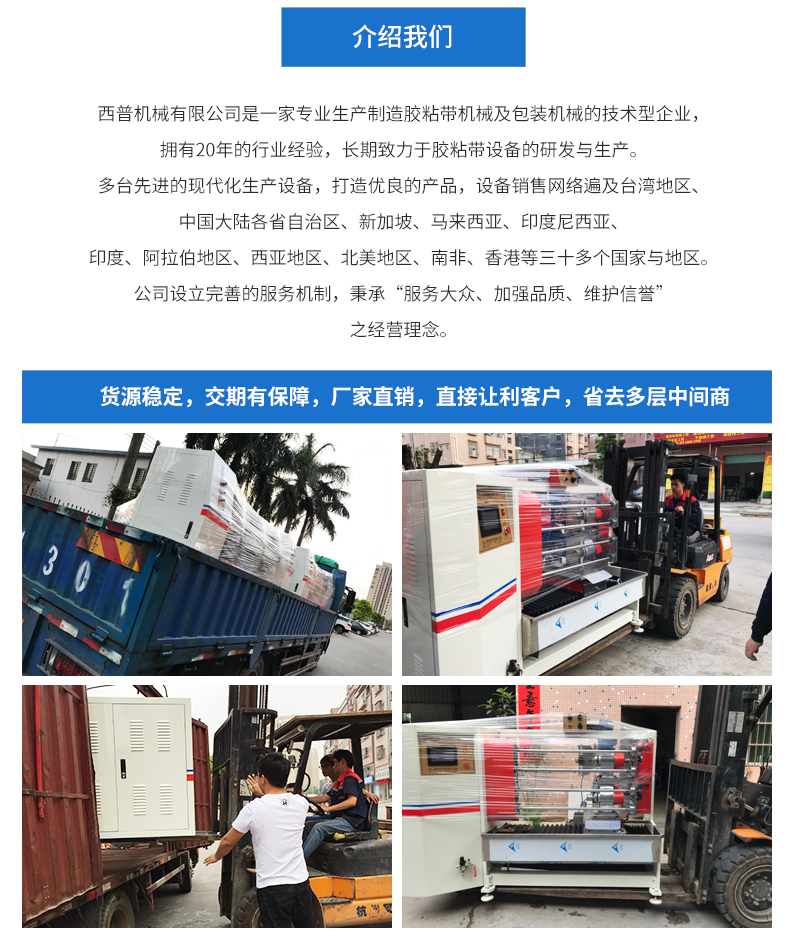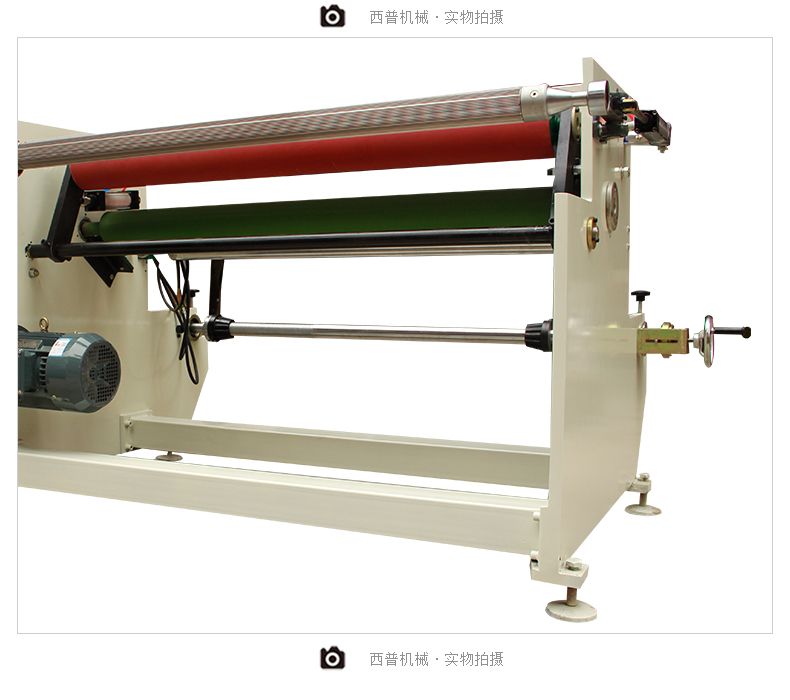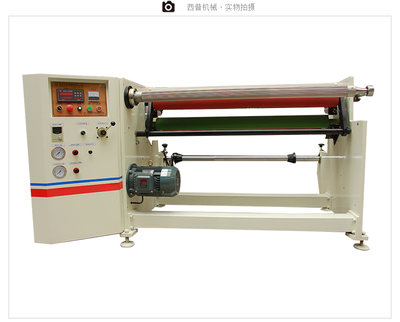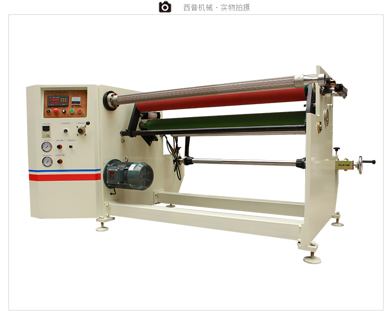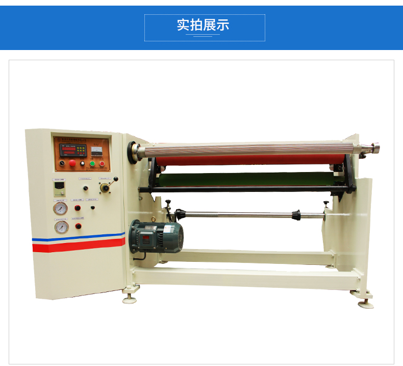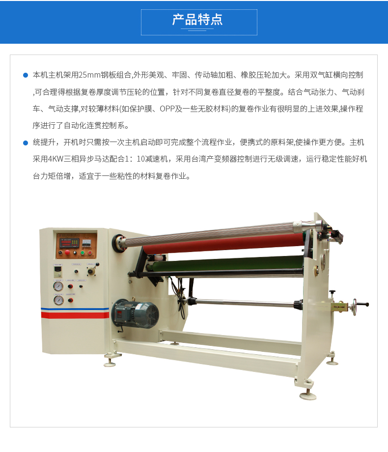 产品特点本机主机架用25mm钢板组合,外形美观、牢固、传动轴加粗、橡胶压轮加大,并采用双气缸横向控制,可合理得根据复卷厚度调节压轮的位置,保证不同复卷直径复卷的平整度。结合气动张力、气动刹车、气动支撑,对较薄材料(如保护膜、OPP及一些无胶材料)的复卷作业有很明显的上进效果,操作程序进行了自动化连贯控制系统提升,开机时只需按一次主机启动即可完成整个流程作业,便携式的原料架,使操作更方便高效,主机采用4KW三相异步马达配合1:10减速机,采用台湾产变频器控制进行无级调速,运行稳定性能好,机台力矩倍增,适宜于一些粘性极强的材料复卷作业。